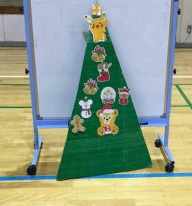 2学期で退舎となる舎生の紹介の後、みんなで「クリスマスツリーをかざろう」ゲームを行いました。