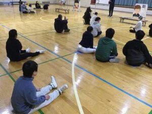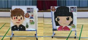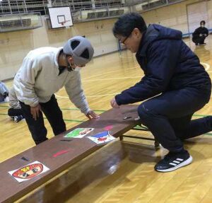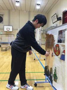 1月13日(火)に体育館で寄宿舎生による全体集会「なかよしお楽しみ会」が行われました。 はじめに3学期から入舎する生徒が自己紹介をして、そのあと福笑いゲームを楽しみました。